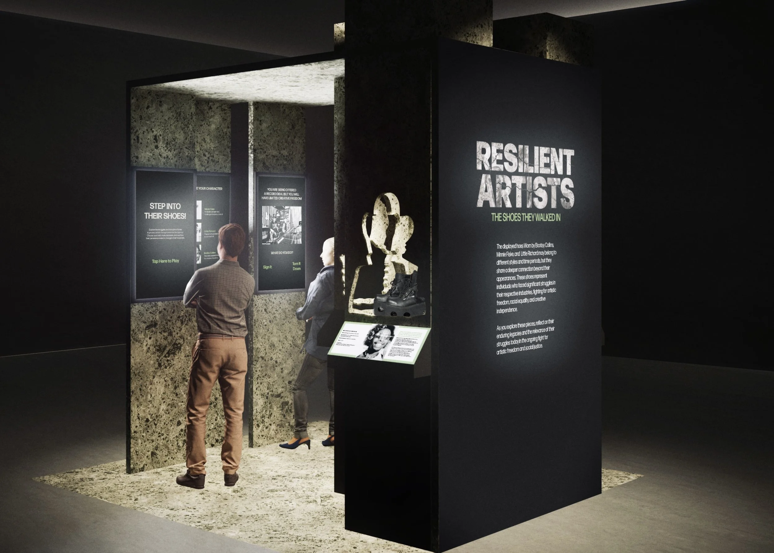 There are 3 touch screens in front of each object, these encourage visitors to play a game where one can explore the lives of Bootsy Collins, Minnie Fiske, and Little Richard. Players make key decisions that reflect each artist’s struggles for creative freedom and industry change. Through engaging choices and challenges, visitors experience the resilience and impact of these legendary figures while learning about their lasting contributions to music and theater.